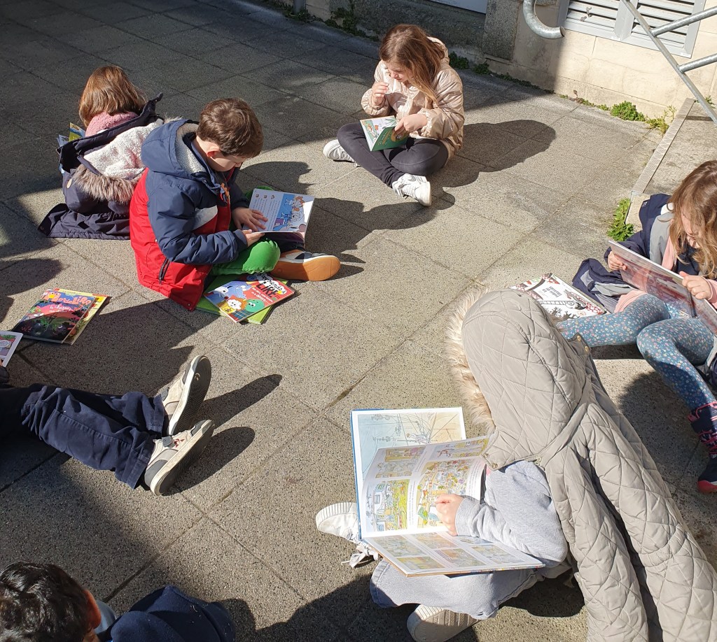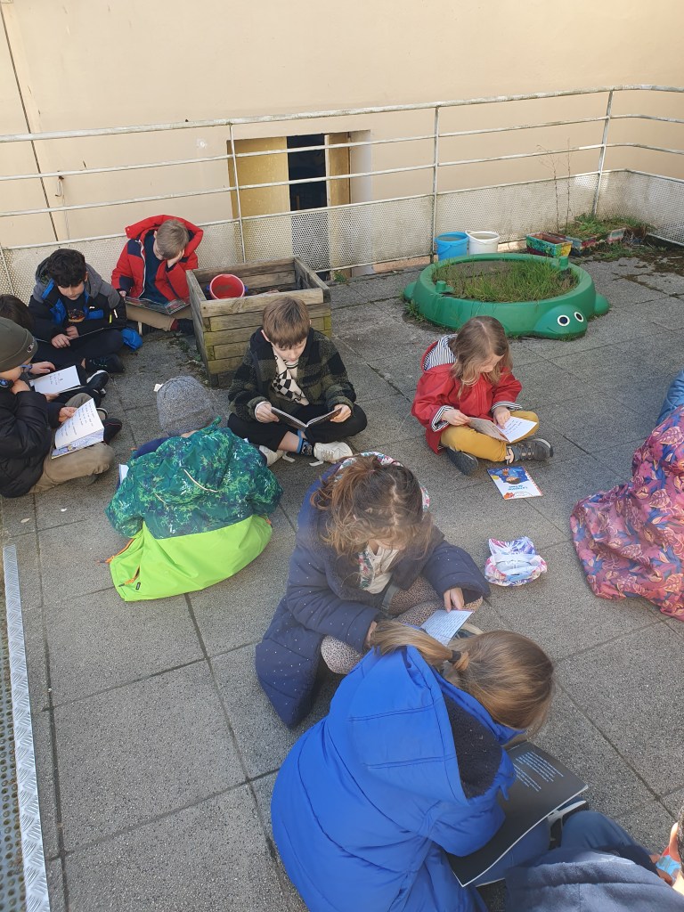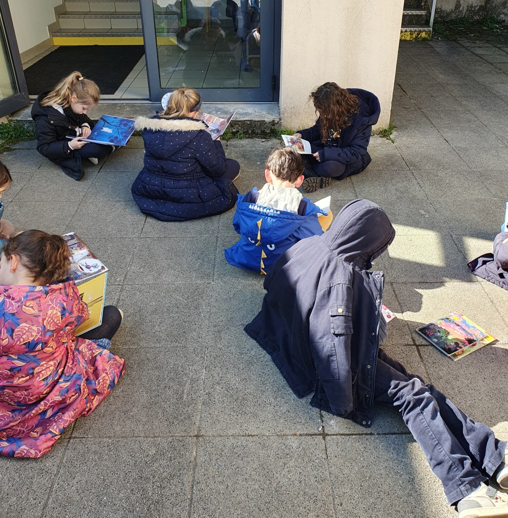 Mardi 4 Mars, nous avons profité du beau temps pour déplacer notre rituel quotidien de lecture en plein air . Sous un doux soleil, les enfants se sont installés confortablement pour lire pendant 15 minutes.